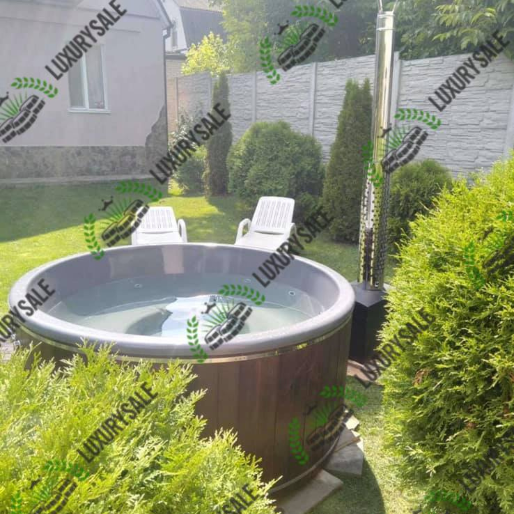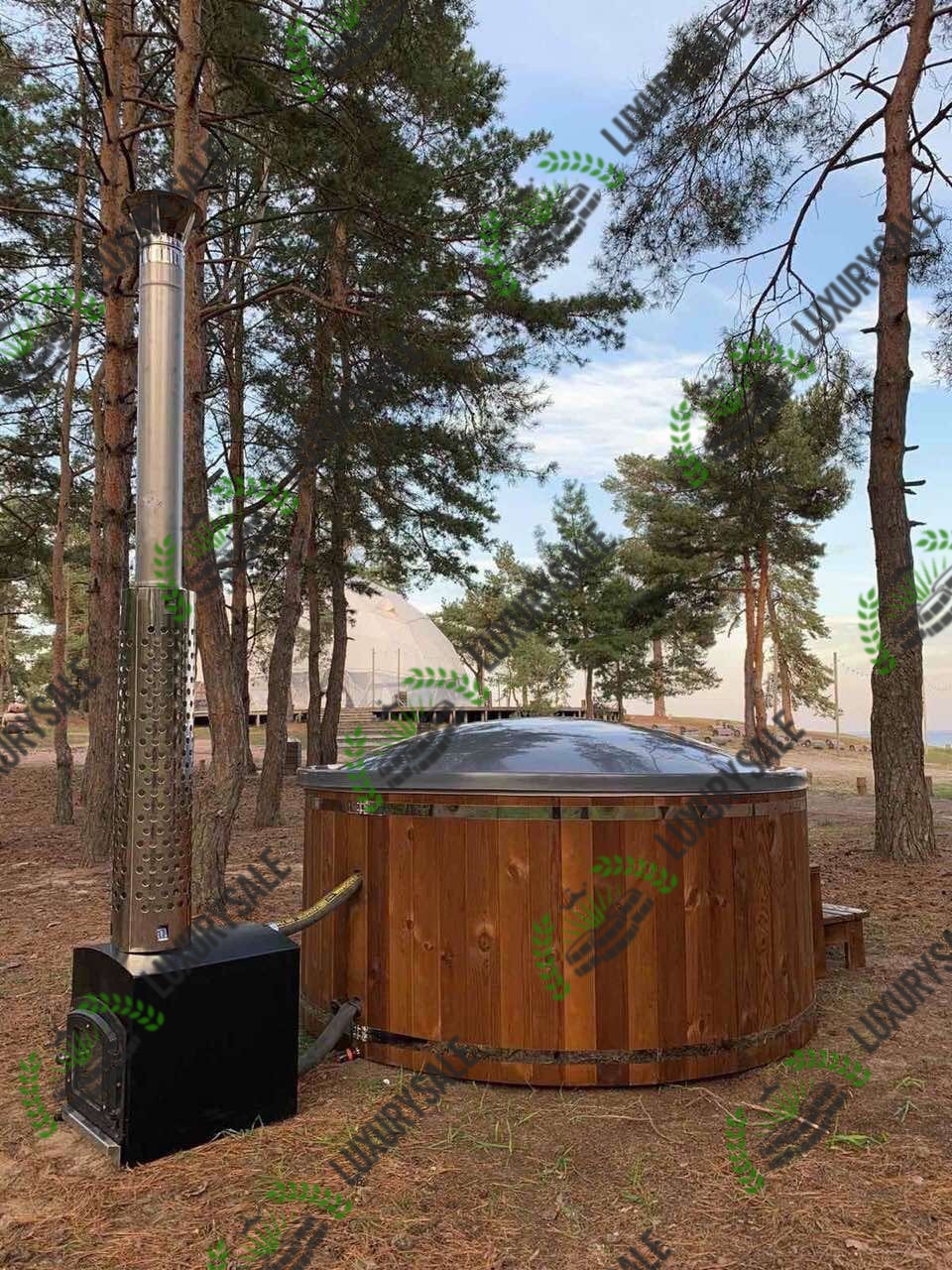 спа-купель із чорною облицювальною панеллю та нержавіючим димоходом біля старовинного колодязя