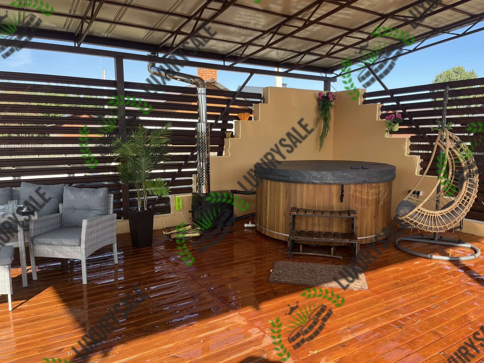 спа-купель «Комфорт» із сосновим облицюванням і вбудованою піччю на подвір’ї приватного будинку