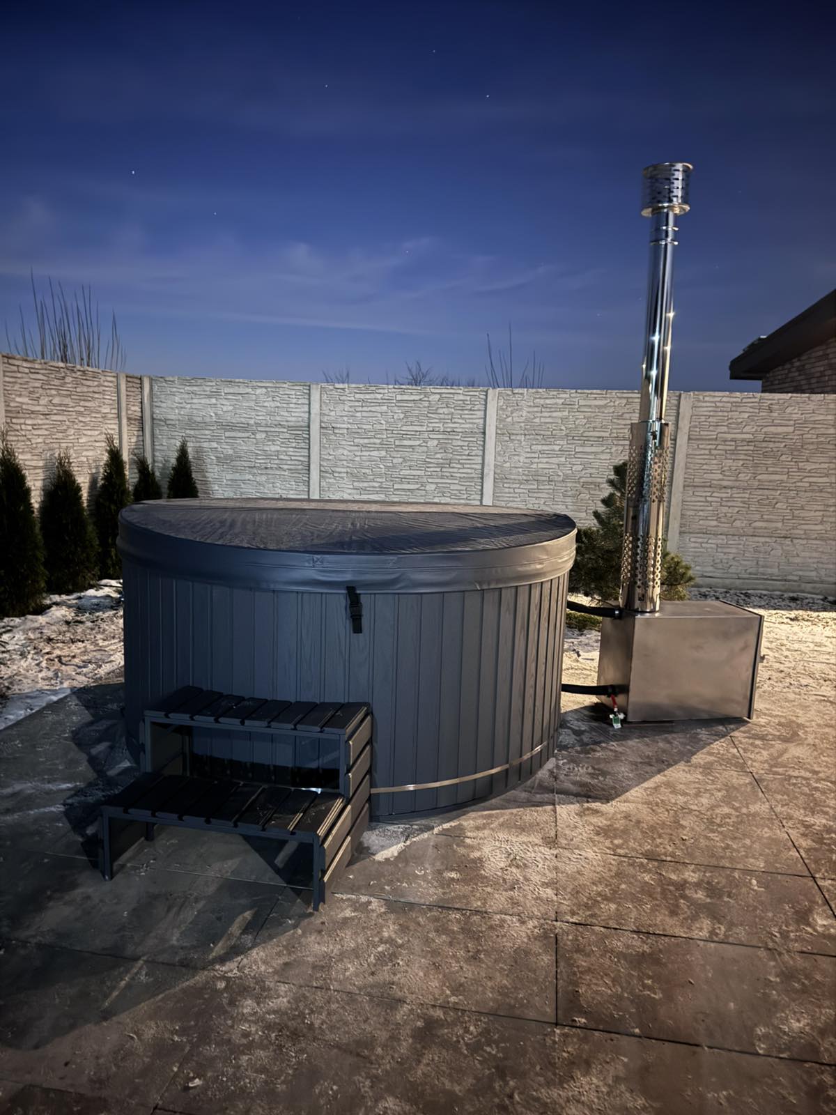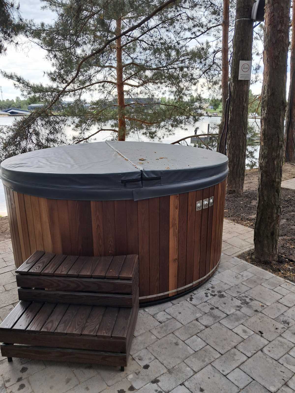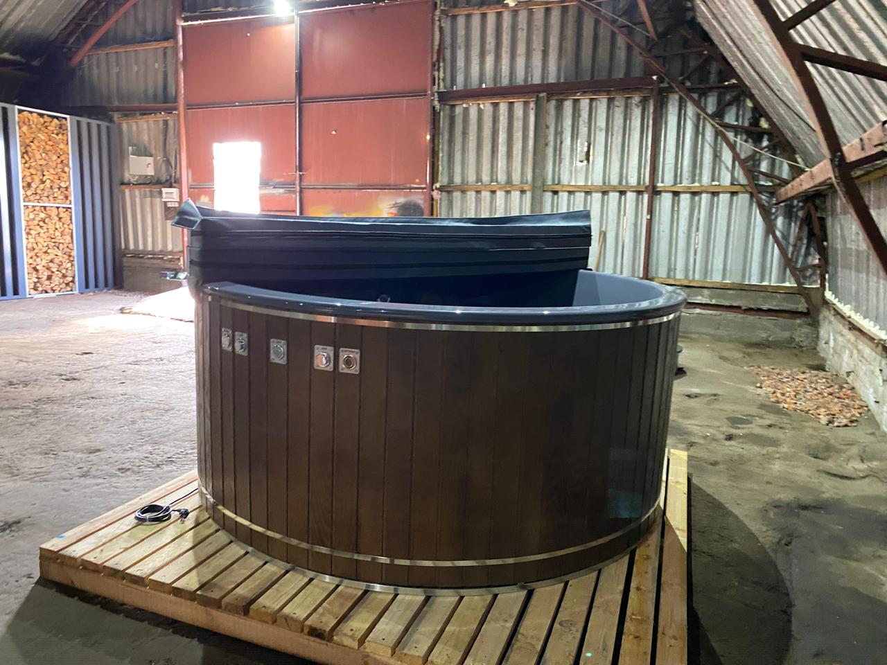 Термокришка діаметром 225 см з пінопластовим наповненням та еко-шкіряною обшивкою. Складається навпіл, має зручні застібки для фіксації до купелі. Надійно утримує тепло до 6 годин після нагрівання води.